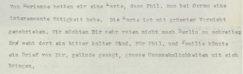“We had a card from Marianne that Phil now has an interesting job at Osram. The card is written with the greatest caution. We would strongly advise you not to write to Berlin. There is a bitter cold wind blowing there. For Phil and his family, a letter from you could be very inconvenient to say the least”