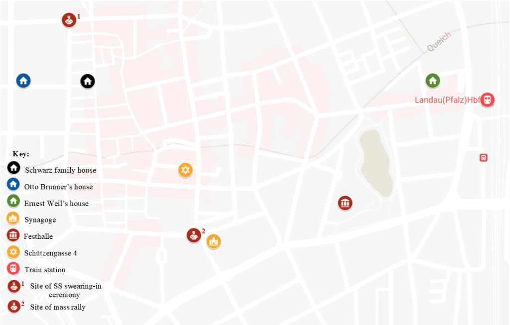 But Landau’s district leader, Wilfried Lämmel, was very clear about his intentions for Landau. On the evening of November 12th, when the process of blowing up the burned remains of the synagogue was underway, the party held a public rally opposite the destroyed temple. Lämmel reportedly praised those who had taken part in the pogrom, before announcing: “Landau was once the largest Jewish town in the Palatinate, the metropolis of Judaism in all of southern Germany […] Landau has been freed from the Jews and will be so for all the future”.